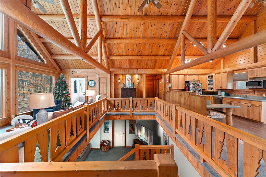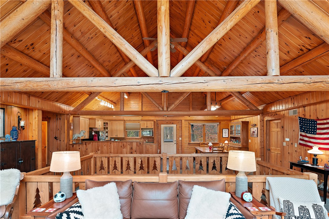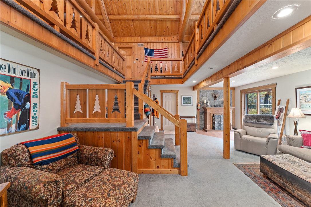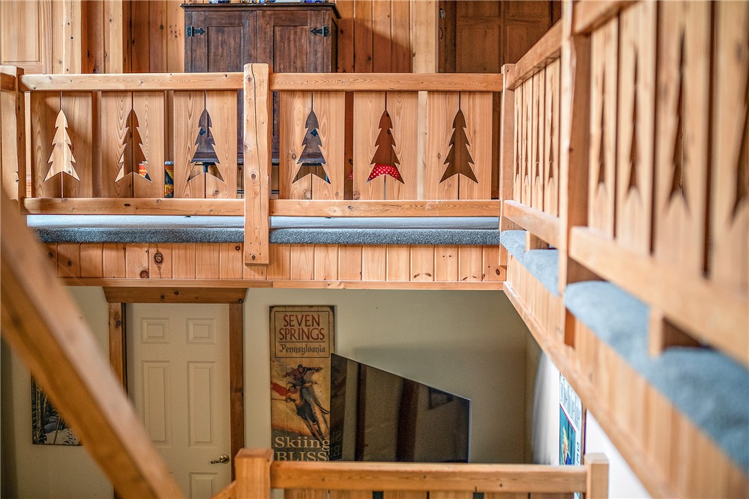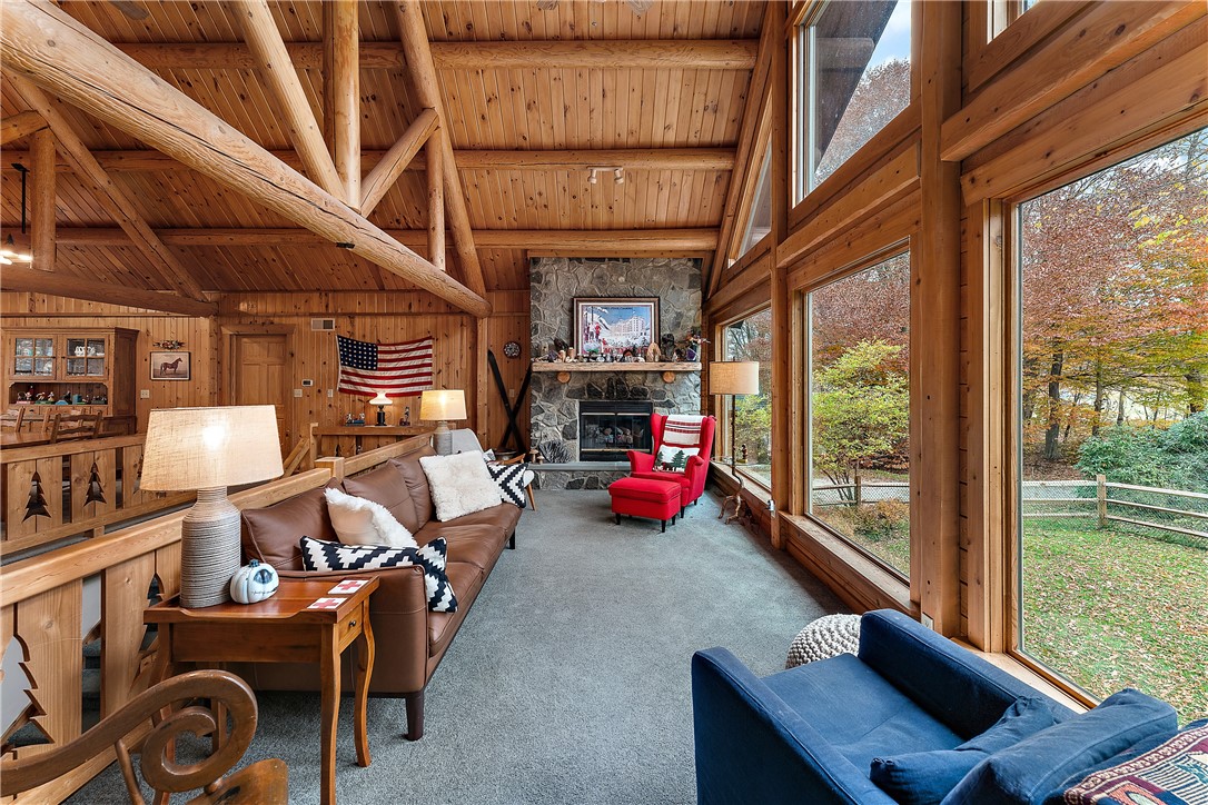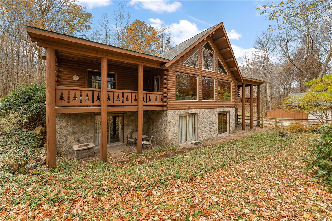 Enjoy the serene beauty of the Laurel Highlands just minutes from the Hidden Valley and Seven Springs Ski Resorts! This remarkable log cabin is just steps from the Laurel Highlands Hiking Trail and the snowmobile trails, making it a haven for outdoor enthusiasts. Inside you'll find soaring cathedral ceilings, exposed beams, and a grand stone fireplace that creates a dramatic focal point. Expansive windows fill the open living space with natural light and forest views. The home offers four spacious bedrooms and three full baths, including a tranquil en suite primary retreat. The finished lower-level provides an ideal space for relaxing. Step outside to the private deck with a hot tub overlooking the large, fenced-in yard. A two-car garage and the large detached garage offer ample storage. Modern updates include newer HVAC system and hot water heater. Whether as a full-time residence or mountain getaway, you can experience the best of Western PA's mountain lifestyle in style and comfort.